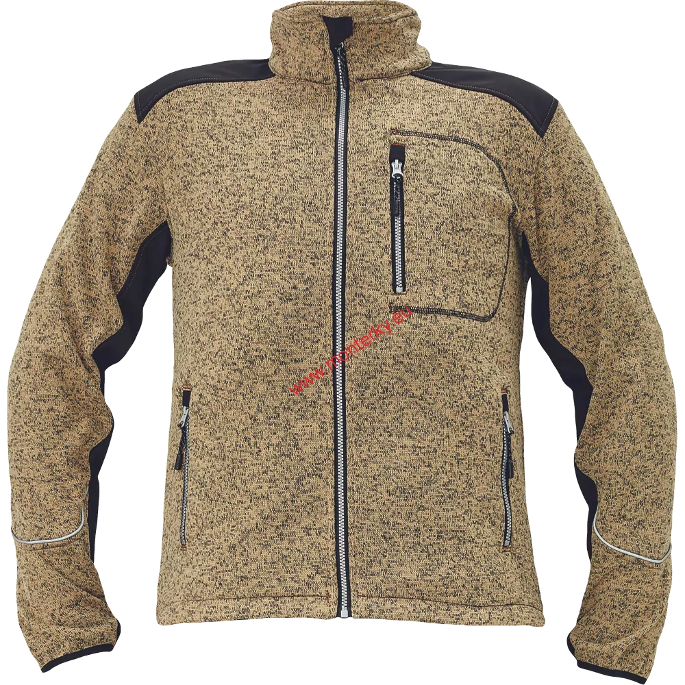 pánský svetr z melírovaného úpletu se zapínáním na zip; zesílená část v oblasti ramen a rukávů softshellovým materiálem; 2 přední kapsy na zip; 1 náprsní kapsa na zip; nastavitelná šíře spodního lemu; očko na palec na konci rukávu.