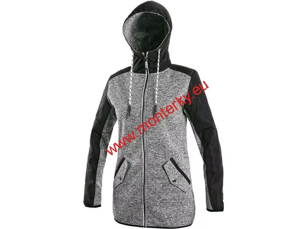 Dámská bunda z pleteniny, prodloužená, kombinace materiálů, kapuce napevno, zapínaní na zip, rukávy zakončeny gumičkou, 2 boční kapsy.