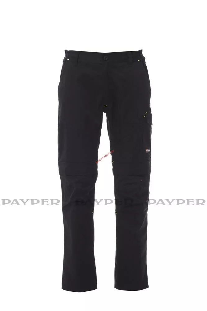 Pánské unisexové kalhoty, s držákem kolenní podložky, elastické pásky na bocích a poutka v pase, zapínání na plastový zip a knoflík, dvě přední kapsy klasického střihu, jedna postranní kapsa LOCK SYSTEM, jedna kapsa na svinovací metr a jedna na smartphone, dvě postranní kapsy, z nichž jedna otevřená a druhá s klopou na suchý zip, kontrastní vsadky a prošití, reflexní pruhy na zadní kapse, trojí prošití.