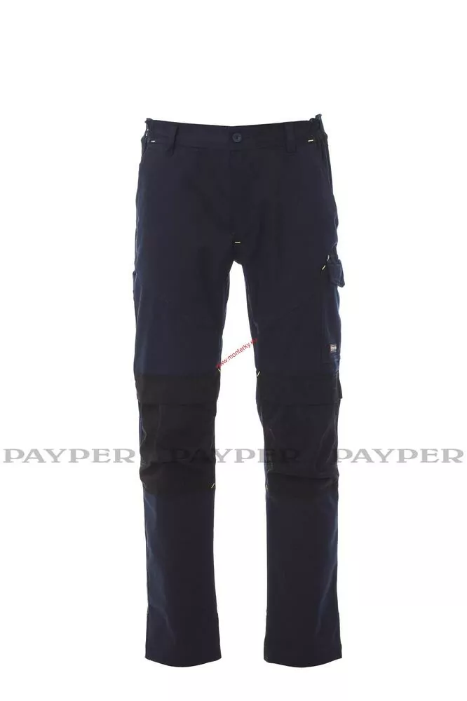 Pánské unisexové kalhoty, s držákem kolenní podložky, elastické pásky na bocích a poutka v pase, zapínání na plastový zip a knoflík, dvě přední kapsy klasického střihu, jedna postranní kapsa LOCK SYSTEM, jedna kapsa na svinovací metr a jedna na smartphone, dvě postranní kapsy, z nichž jedna otevřená a druhá s klopou na suchý zip, kontrastní vsadky a prošití, reflexní pruhy na zadní kapse, trojí prošití.