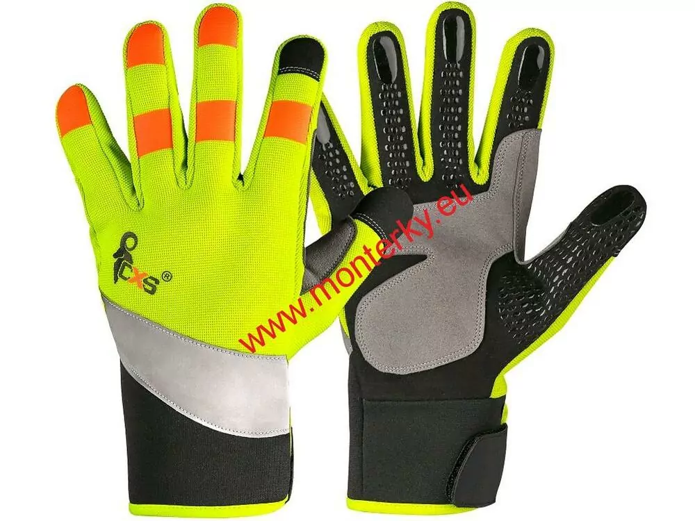 Kombinované rukavice s reflexním páskem a silikonovými aplikacemi na prstech pro lepší úchop a manipulaci. Dlaň je vyrobena ze syntetické kůže (mikrovlákna), díky které jsou rukavice pohodlné a odolné vůči srážení, natahování a tvrdnutí. Hřbet z prodyšného Spandexu s PU reflexním páskem. Neoprenová manžeta se suchým zipem se snadno přizpůsobí zápěstí. Baleny s blistrem.