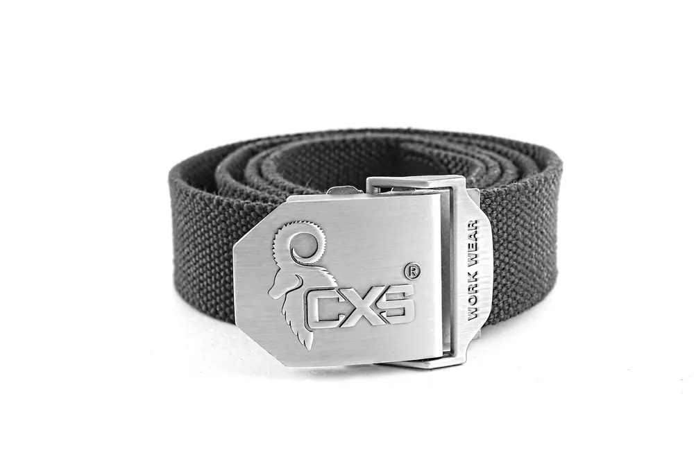 Textilní opasek, kvalitní kovová spona s logem CXS, jednoduché patentní zapínání opasku.