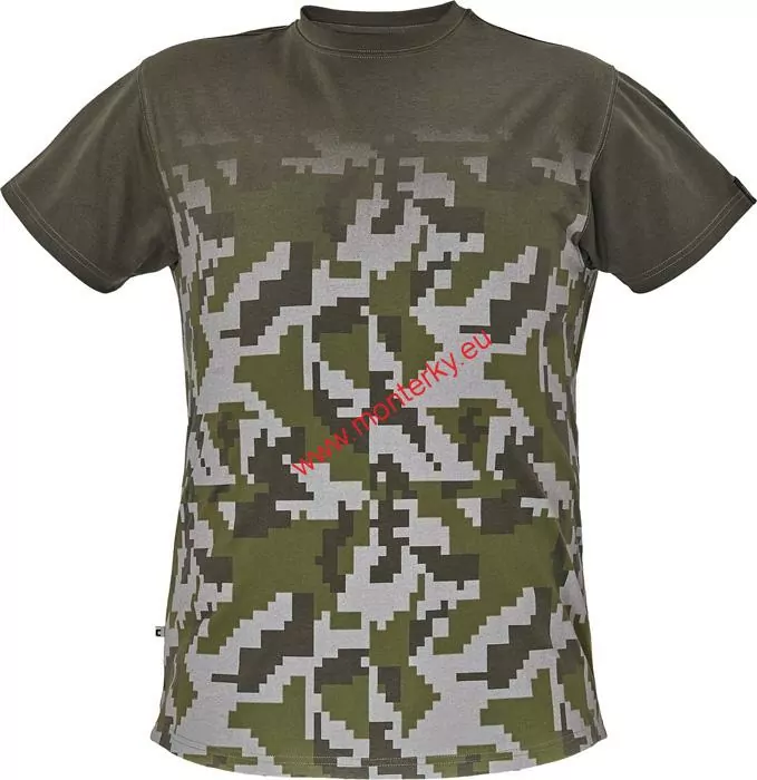 Popis: pánské tričko s krátkým rukávem v moderním maskáčovém vzoru; elastický zesílený průkrčníkem.