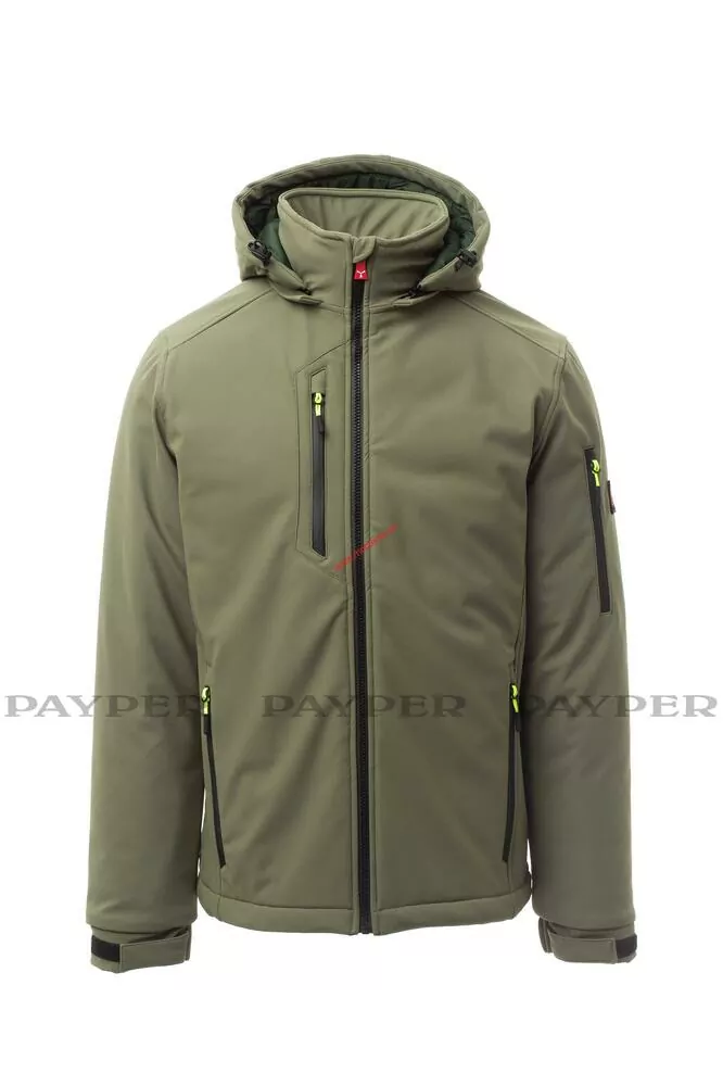 WP 8000 mm H₂O, WVT 5000 g/m² 24h. Pánský zateplený softshell, zapínání na zip SBS s kovovým jezdcem „semi-auto lock“ a přizpůsobeným taháčkem. Odnímatelná kapuce se stahovací šňůrkou. Vnitřní límec s flísovými bočními prvky. Reflexní pruhy na zádech a zadní straně kapuce. Elastické stahovací manžety na suchý zip. Dvě boční kapsy na zip, jedna kapsa na hrudi s voděodolným zipem a jedna kapsa na levé paži s integrovaným očkem na pero na zip. Fluorescentní taháčky. Jedna vnitřní prostřižená kapsa na suchý zip. Spodní část stažitelná pomocí přizpůsobených zarážek.