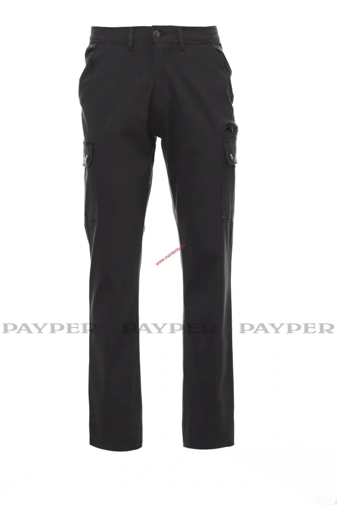 Pánské kalhoty, streč, celoroční, elastické pásky na bocích a poutka v pase, zapínání na zip a na kovový knoflík, dvě přední kapsy klasického střihu, dvě postranní kapsy s klopou a druky, jedna kapsa na zip po levé straně, skrytá kapsa na svinovací metr po pravé straně, dvě zadní prostřižené kapsy s knoflíkovou dírkou a knoflíkem.