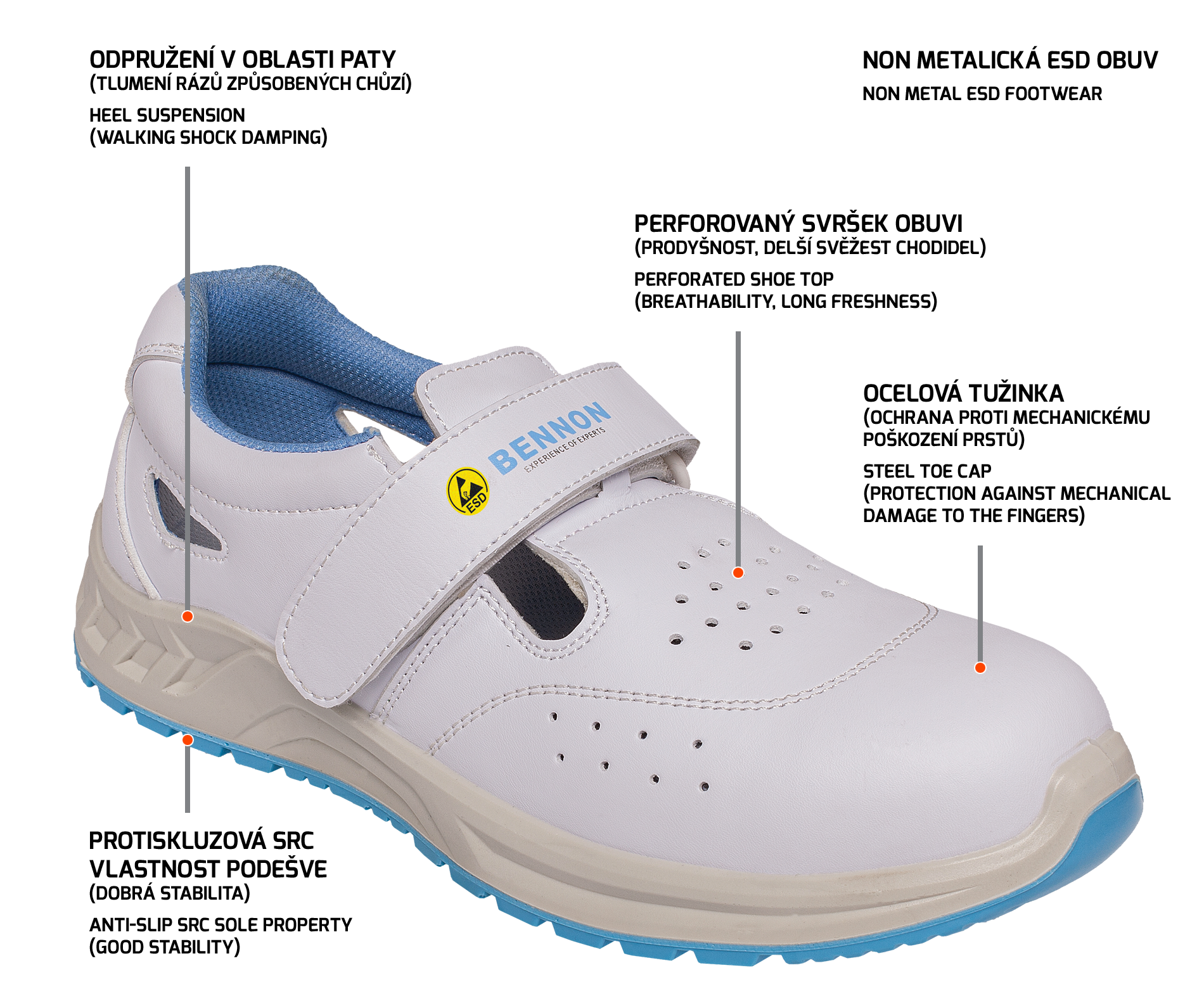 Bílá, dobře omyvatelná, antistatická obuv s ESD vlastnostmi.
