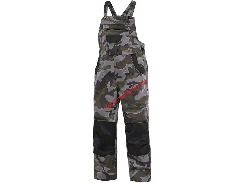 Dětské maskáčové kalhoty s náprsenkou, vybaveny zesílenými koleny a sedem pro delší životnost. Pas na knoflíky, vzadu do gumy, šle s gumou vzadu, náprsní kapsa na zip s menší kapsou, přední i zadní kapsy, boční kapsa, reflexní doplňky.
